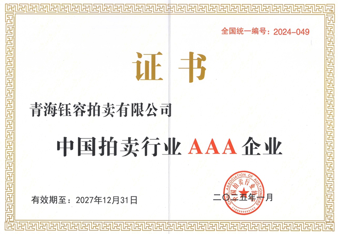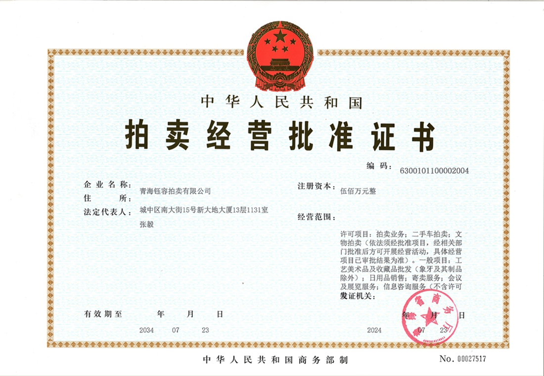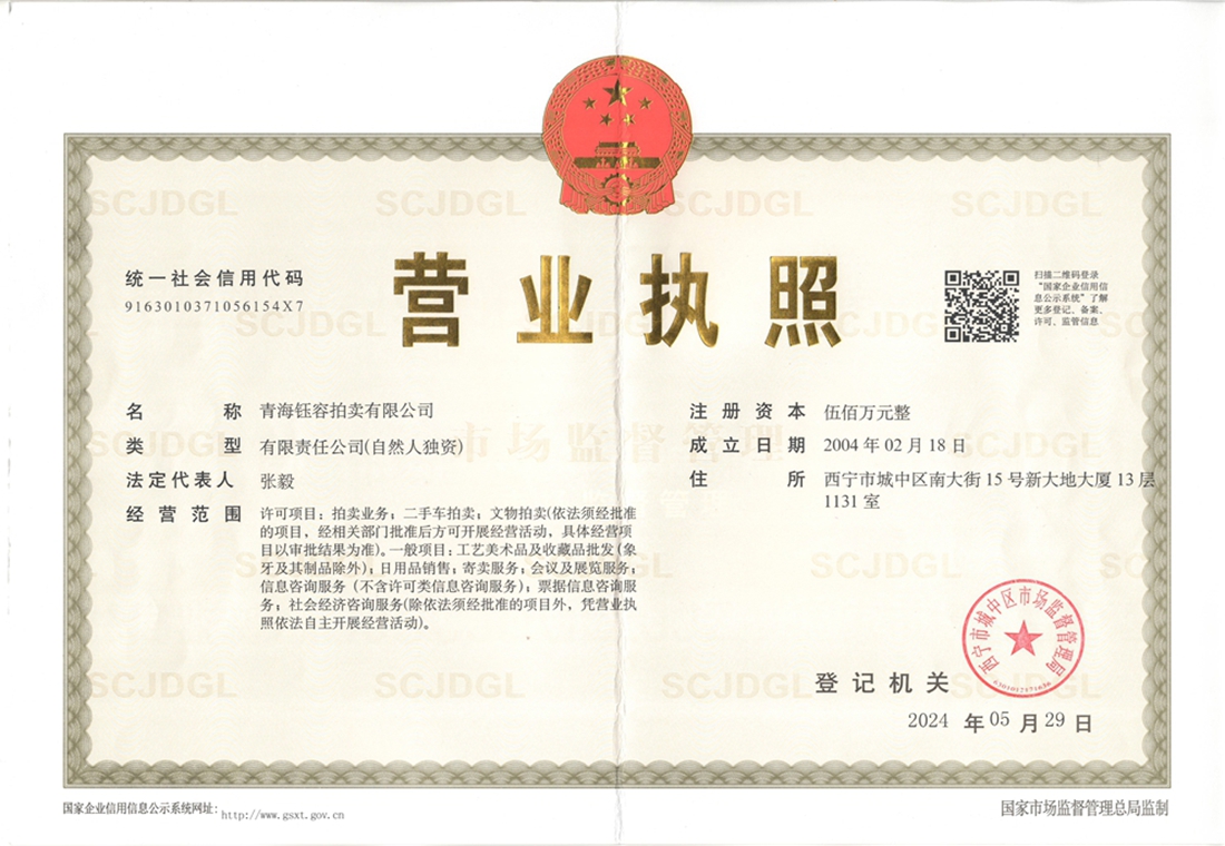 青海钰容拍卖有限公司成立于2004年,是经青海省人民政府同意、省工商行政管理部门核准注册、省商务厅批准成立的具有独立法人资格的拍卖企业,注册资金500万元。公司实行总经理负责制,内部设有业务拓展部、策划部、拍卖部、信息咨询部、财务部和办公室六个独立部门,有近一千平方米的办公场地,配套设施齐全,拥有一支由国家注册拍卖师、会计师、鉴定估价师等各领域专业人士组成的团队。