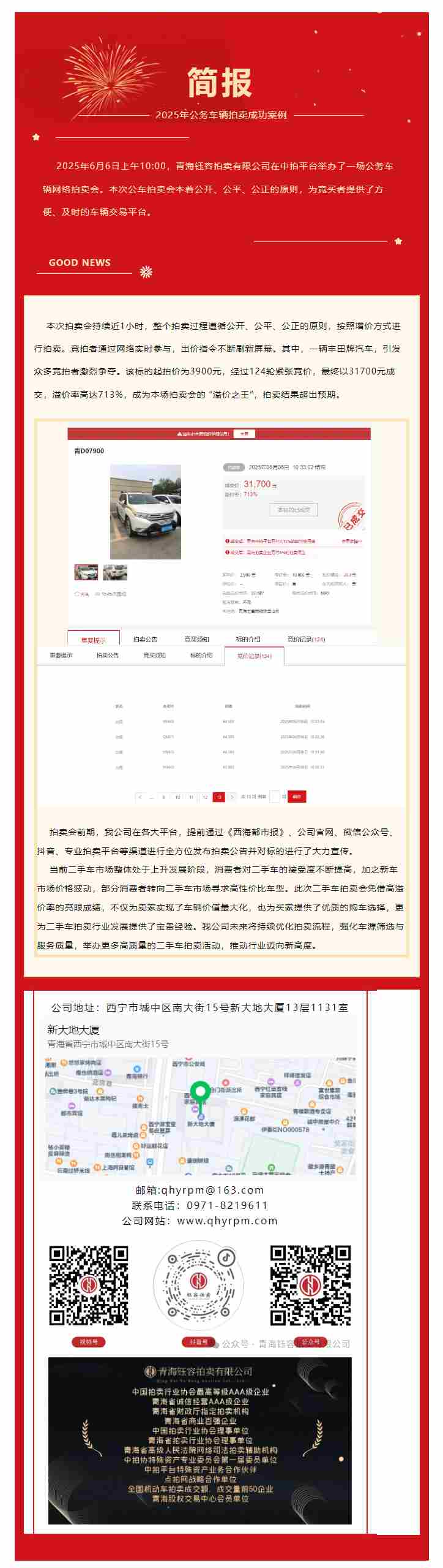 【2025年6月6日拍卖简报】公务车辆拍卖溢价713%