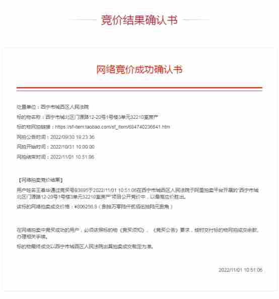 2022年09月30日,上述标的网拍公告在淘宝网司法拍卖平台上发布,公开征询竞买人。标的物于2022年10月31日10:00:00开始竞拍,此次拍卖共有2位意向竞买人参与报名,经过44轮竞价之后于2022年03月27日10:36:49 拍卖结束, 该标的物由买受人王春华(身份证号:350421198906235018)以806256.8元(大写人民币:捌拾万零陆仟贰佰伍拾陆元捌角)竞拍成功,竞买号为B3895,上述标的第一次网络司法拍卖竞拍成功,充分体现了网络司法拍卖的公开、公正、公平。至此该标的物网拍程序终结,我公司将继续做好其他后续辅助服务工作,特向贵院报告,并附上相关文件。